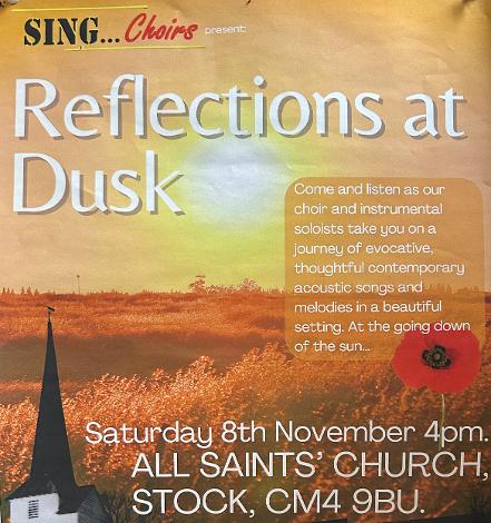 On the afternoon before Remembrance Sunday, join us at All Saints’ Church in Stock for “Reflections at Dusk”. This concert, at 4pm on Saturday 8th November, will be performed by the local SING choir and instrumental soloists. Advance tickets will be £7 (£4 for under-16s). You may have heard the choir at our recent Flower Festival. Now join them for a journey of evocative, thoughtful songs and melodies.