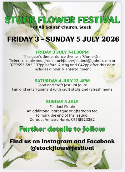 Dates are fixed for the 2026 Flower Festival weekend. And we are returning to our midsummer slot on the Glebe at All Saints’ Church in Stock. See above for details, including early bird ticket prices.